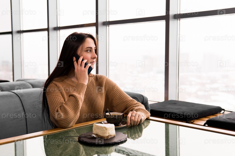 Молодая женщина в кафе разговаривает по телефону