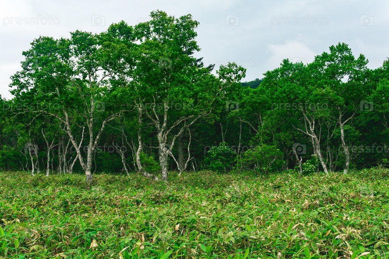 Лесной пейзаж острова Кунашир, муссонный прибрежный лес с изогнутыми березами и зарослями бамбука