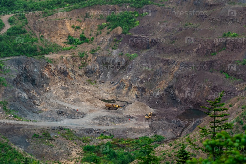 Небольшой карьер с горнодобывающей техникой в горной местности