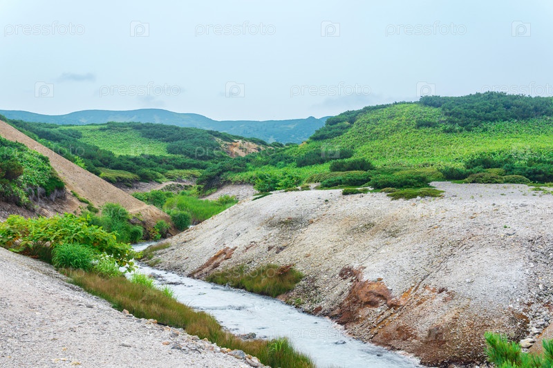Геотермальный минерализованный поток среди берегов вулканического пепла и тефры в кальдере вулкана Головнина, остров Кунашир