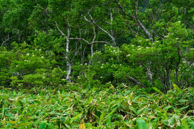 Лесной пейзаж острова Кунашир, муссонный прибрежный лес с изогнутыми березами и зарослями бамбука