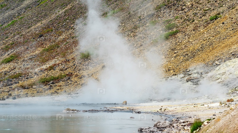 Выход горячих гидротермальных вод на берегу озера в кальдере вулкана Головнина на острове Кунашир