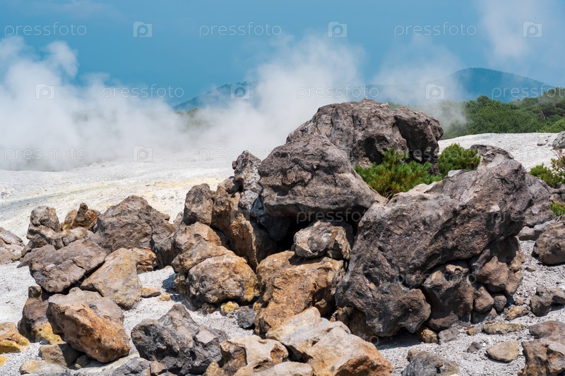 Растения среди блоков застывшей лавы в фумарольном поле на склоне вулкана