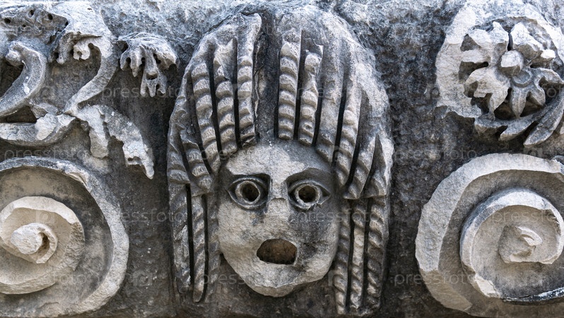 Каменное лицо на руинах здания в древнем городе Мира, Турция