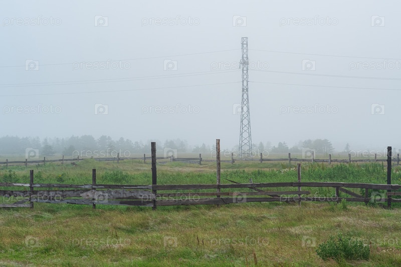 Сельский пейзаж, загон для скота на туманном пастбище