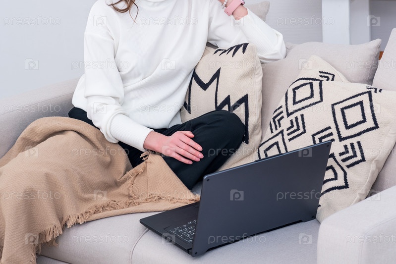 Женщина сидит на диване в помещении и работает с ноутбуком