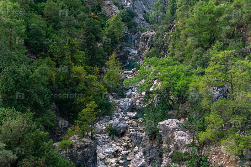 Лесистый горный каньон с ручьем в скалистой постели, вид сверху