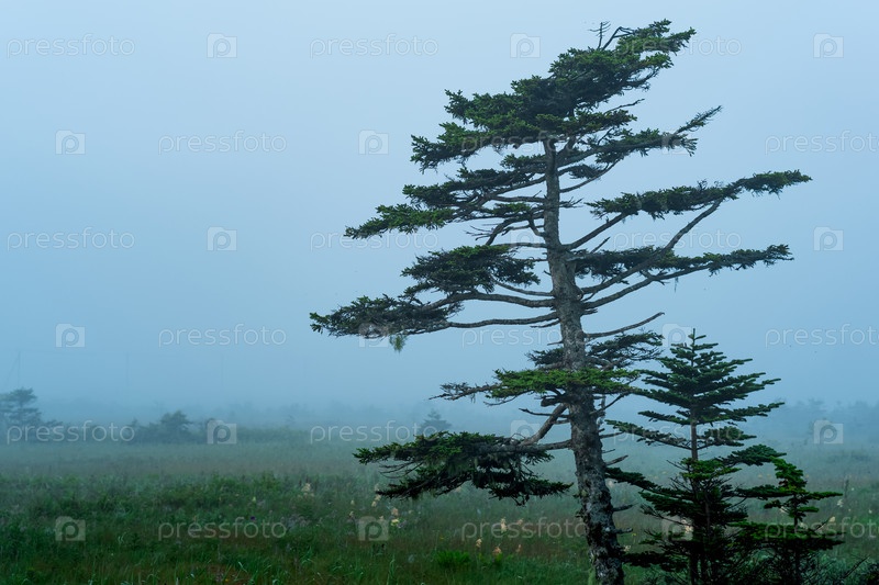 Туманный утренний пейзаж с красивыми чахлыми соснами