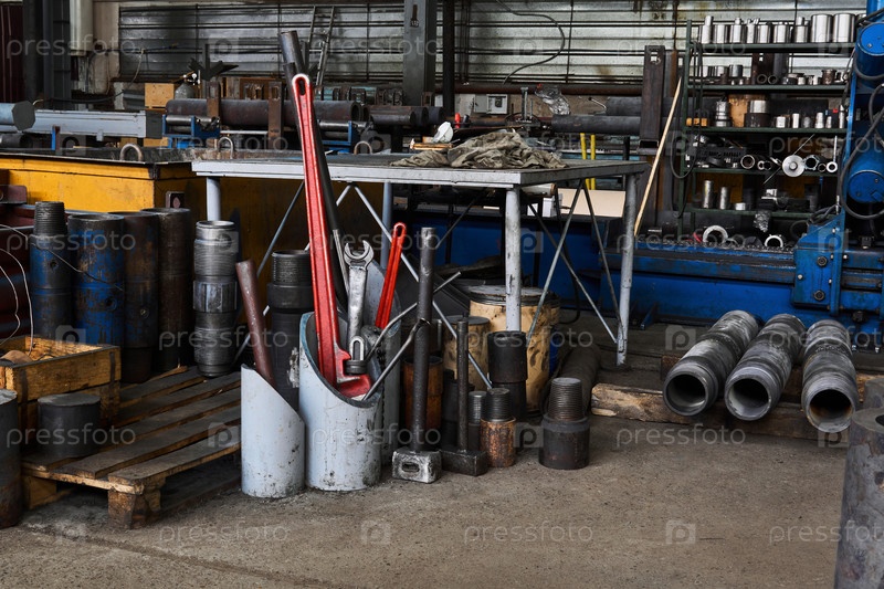 Интерьер заводского цеха с деталями бурового оборудования и различными инструментами