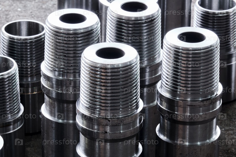 Промышленный фон - в мастерской новая блестящая стальная фурнитура, детали турбобуров разного диаметра