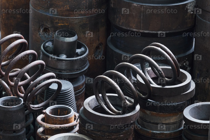 Промышленный фон - ржавое оборудование, в мастерской находятся части турбобуров разного диаметра