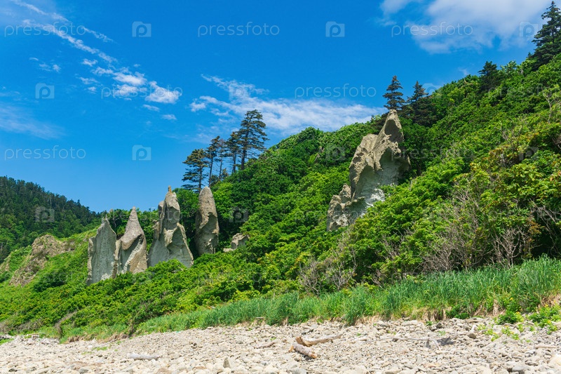 Прибрежный пейзаж, красивые лавовые скалы на зеленом побережье острова Кунашир