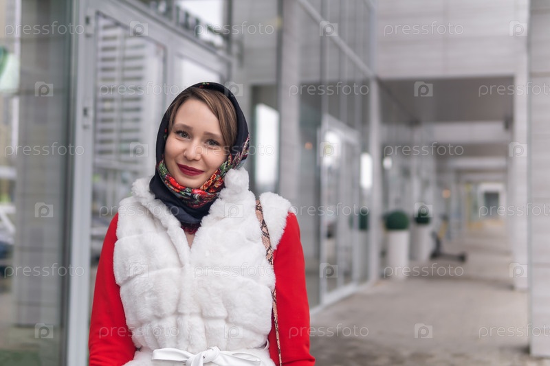 Счастливая молодая женщина в платке в холодную погоду на открытом воздухе