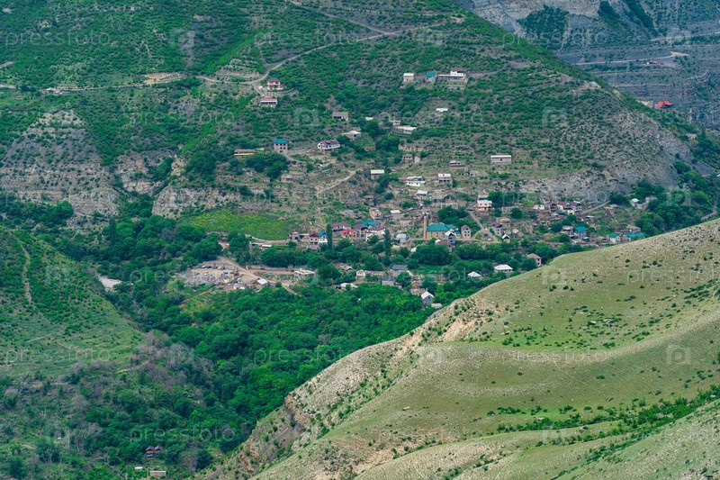 Пейзаж с деревней на склоне горы в высокогорье в Дагестане, Кавказ