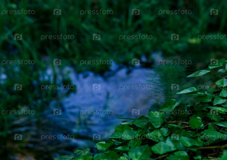 Размытый пейзаж тенистого лесного озера или болота, сосредоточьтесь на листьях плюща на переднем плане