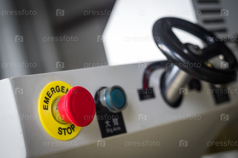 Большая красная кнопка аварийной остановки рабочего оборудования и машин на производственной площадке завода. Аварийная система отключения машин во избежание несчастных случаев. Селективный фокус