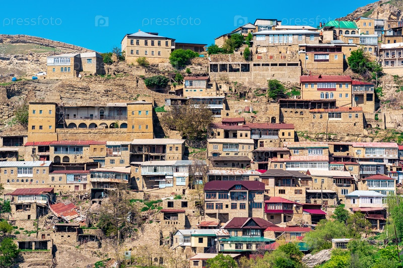 Фасады домов, расположенных ярусно на крутом склоне в селе Чох в Дагестане