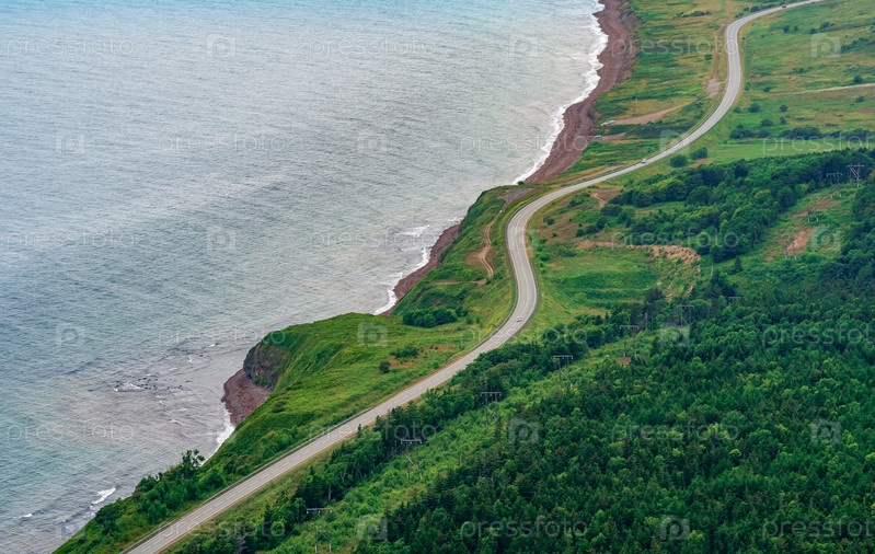 Дорога вдоль холмистого морского побережья, вид сверху