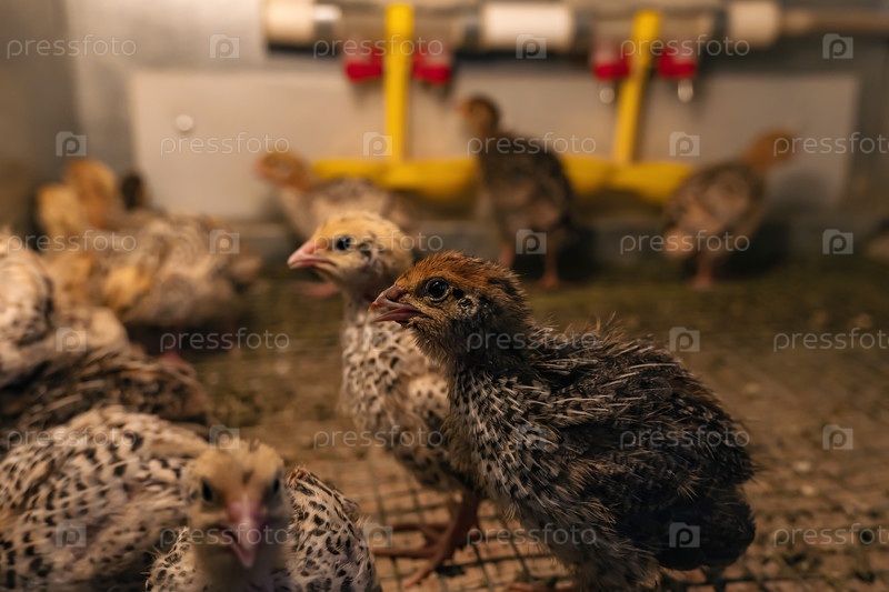 Домашних перепелиных цыплят держат в брудере в курятнике, крупный план