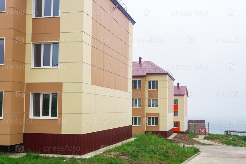 Городской пейзаж приморского поселка Южно-Курильск на острове Кунашир