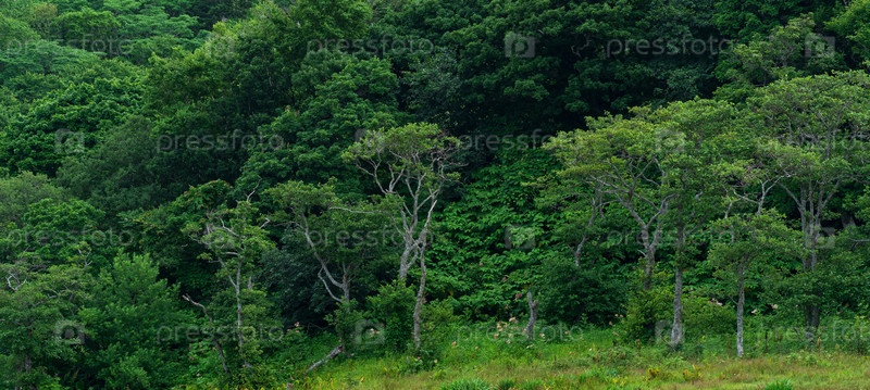Туманный горный лес на склоне вулкана на острове Кунашир