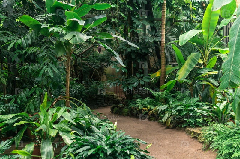 Интерьер большой теплицы с тропическими растениями