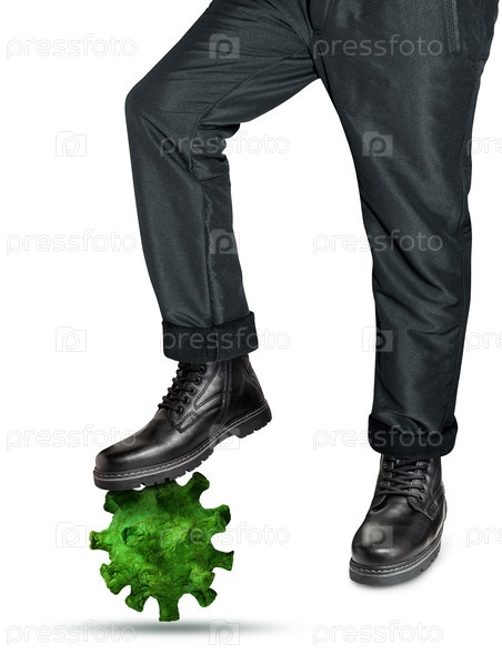Мужчина в кожаных ботинках наступает на модель вируса