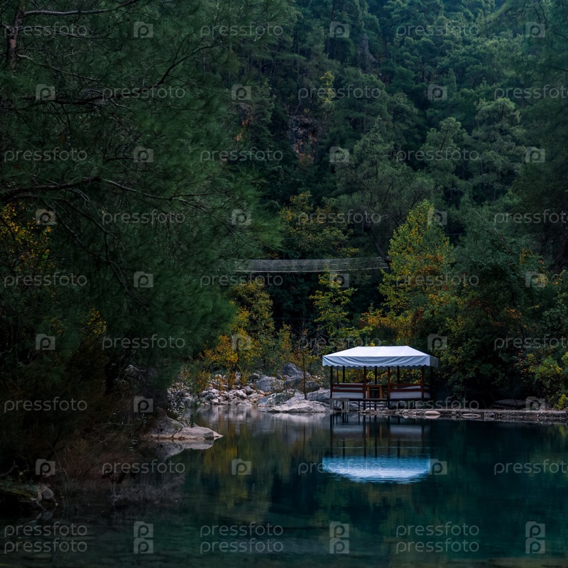Осенний горный пейзаж с тенистым озером, беседкой для пикника и подвесным мостом