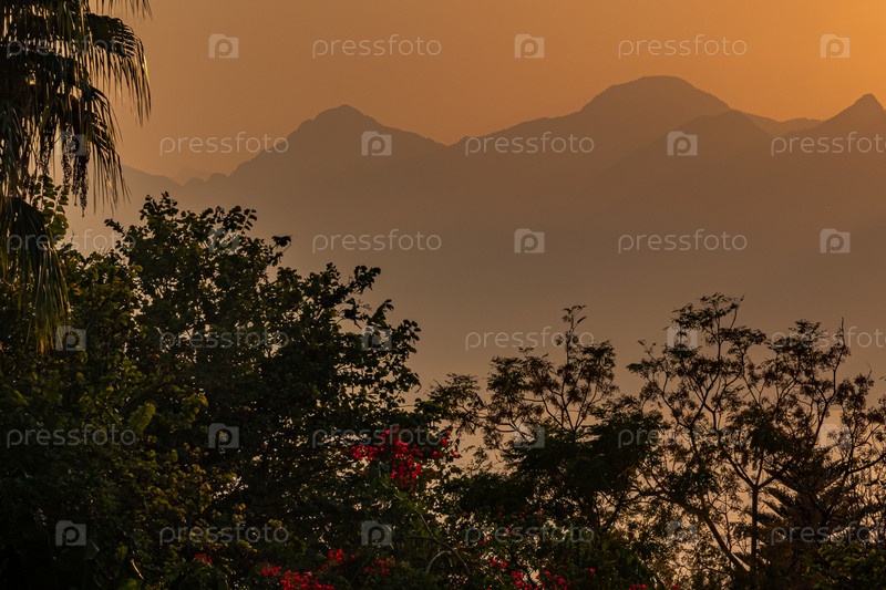 Сумеречный тропический пейзаж - силуэты растительности и туманные горы во время заката