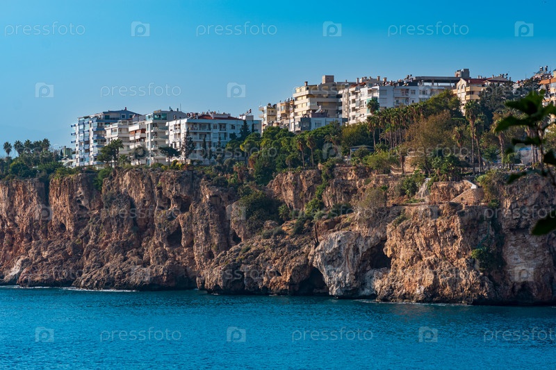 Морской пейзаж с жилыми домами и отелями на крутом побережье Антальи, Турция