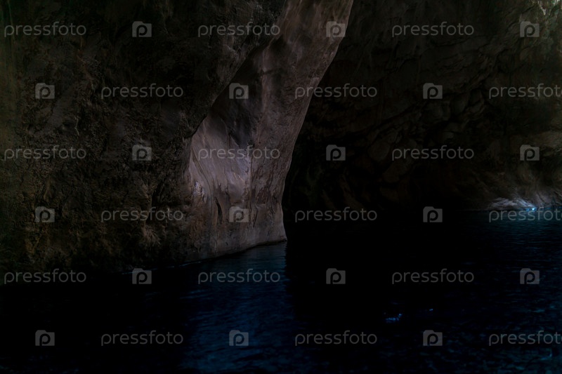 Чистая подземная пещерная река в крутых каменных берегах в темноте