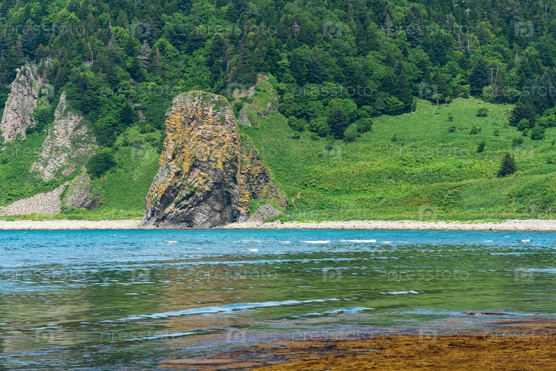 Прибрежный пейзаж, красивые лавовые скалы на зеленом побережье острова Кунашир, водоросли на побережье во время отлива