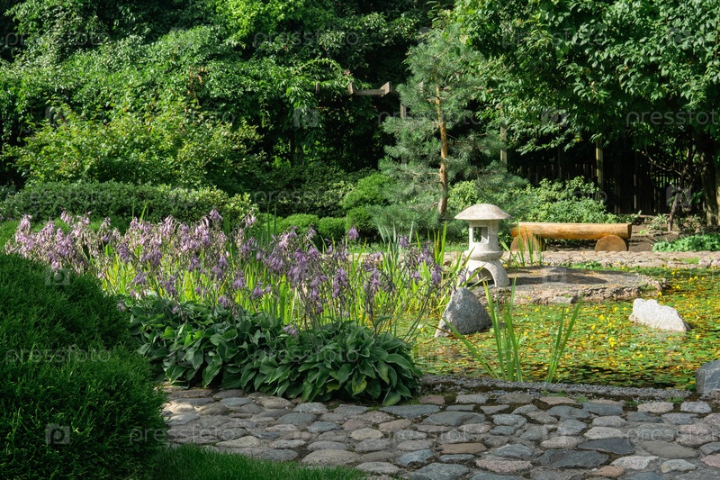 Каменный фонарь на небольшом острове посреди пруда в японском саду