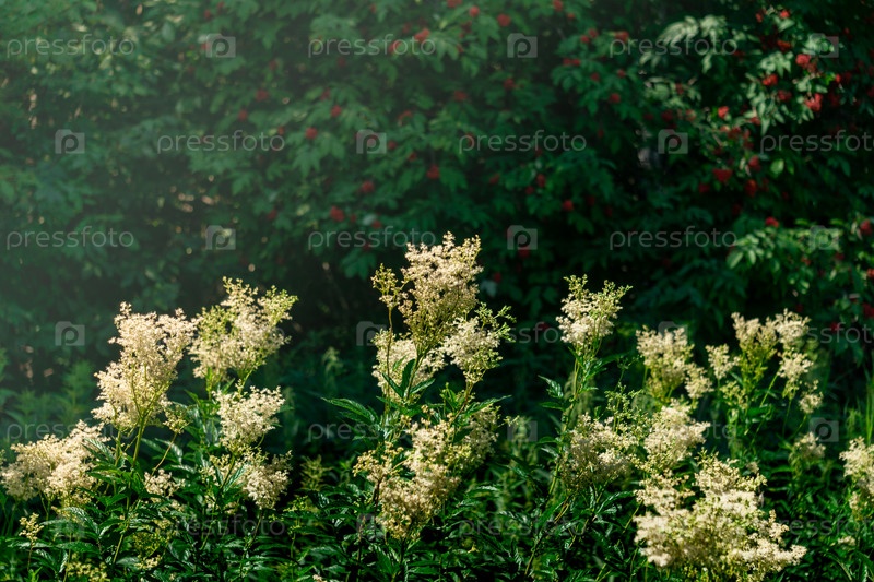 Соцветия лабазника на фоне размытой тенистой листвы и ягод