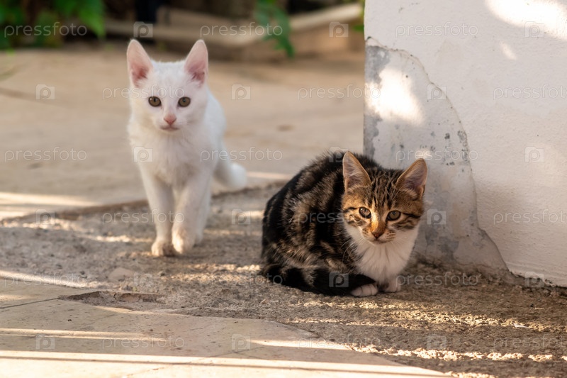 Два котенка сидят на дорожке в саду возле стены