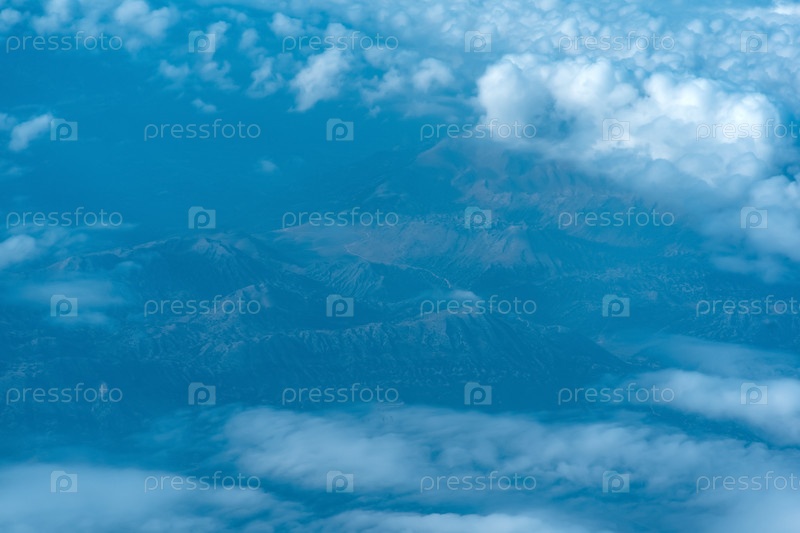 Вид на землю внизу во время полета над облаками, гористая местность сквозь атмосферную дымку, вид сверху