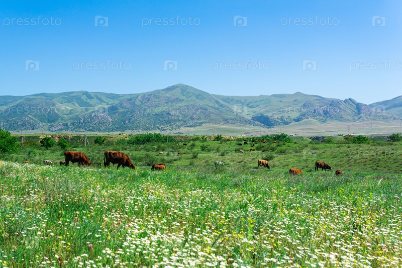 Цветущие весенние луговые пастбища с выпасом скота в предгорьях Кавказа