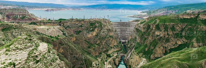 Горный пейзаж с арочной плотиной гидроэлектростанции и водохранилищем в долине