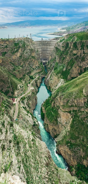 Вид на арочную плотину с водосбросом в каньоне