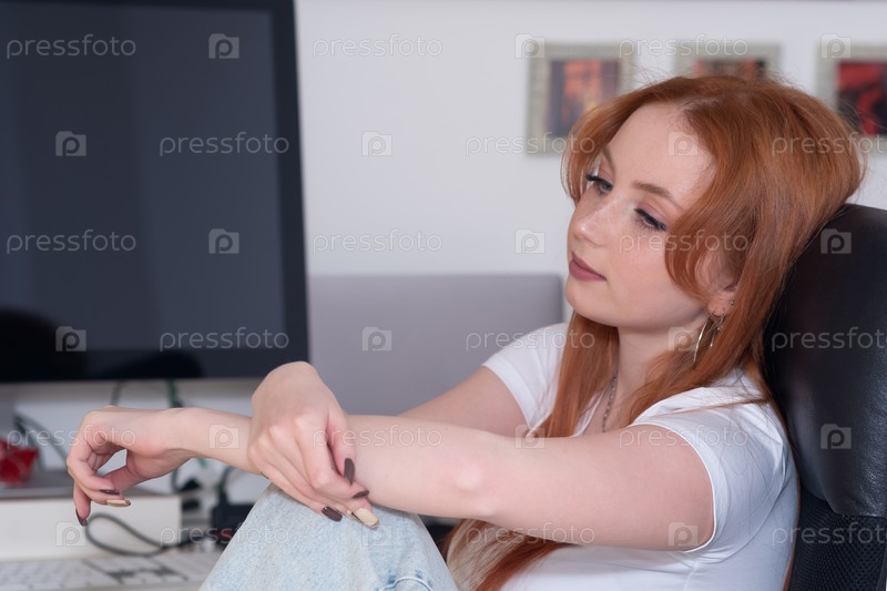 Молодая женщина сидит за столом перед монитором компьютера и отдыхает