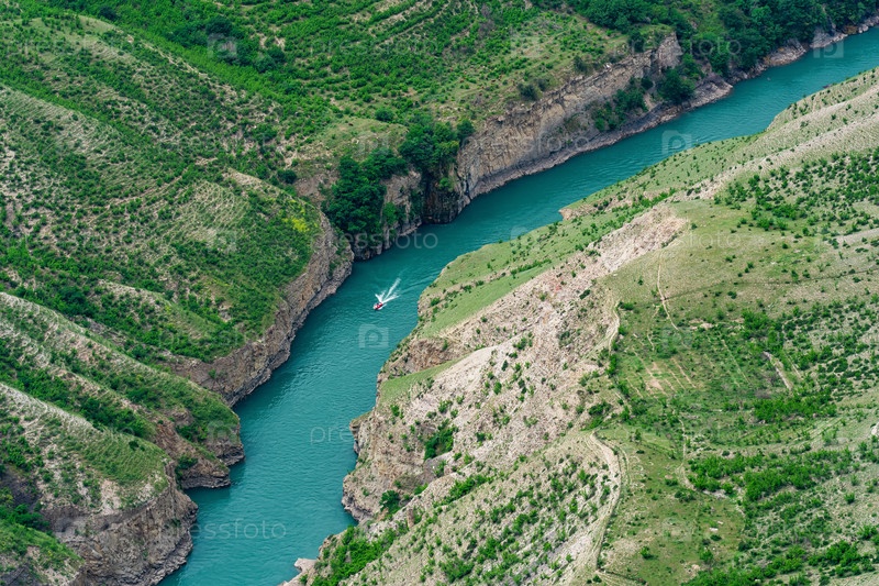 Горный пейзаж с глубоким каньоном с голубой рекой, по которой движется моторная лодка