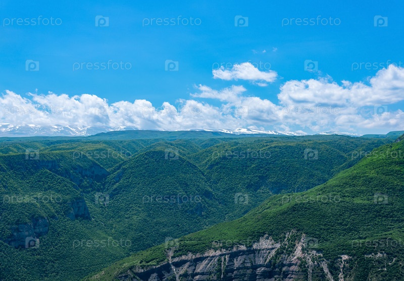 Красивый лесистый горный пейзаж с заснеженным хребтом на заднем плане