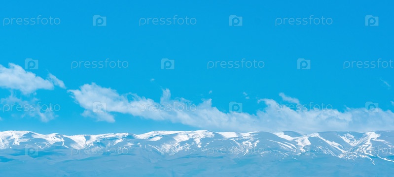 Пейзаж голубого горного неба, снежные вершины горного хребта вдалеке под ясным небом с облаками
