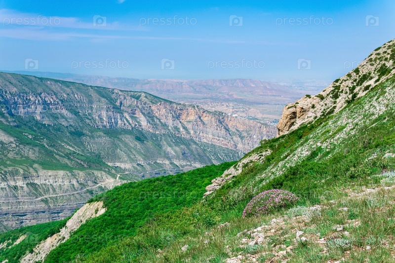 Весенний горный пейзаж с цветущим мхом Кэмпионом на переднем плане и скалистыми утесами на заднем плане, Дагестан