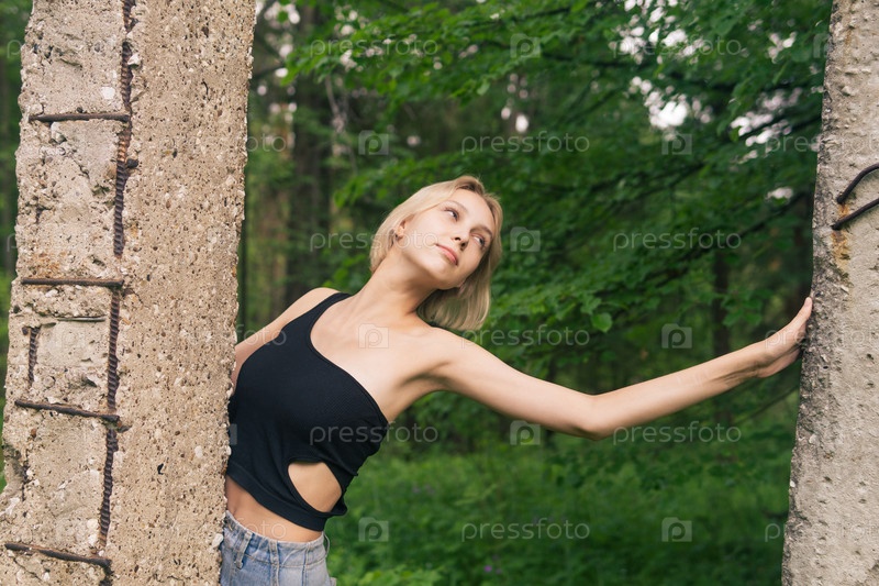 Молодая женщина позирует рядом с бетонными сваями среди природного ландшафта