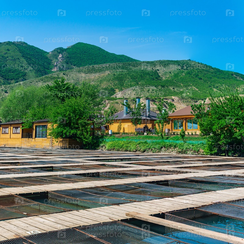 Рыбная ферма в горной долине с клетками для аквакультуры и деревянными постройками