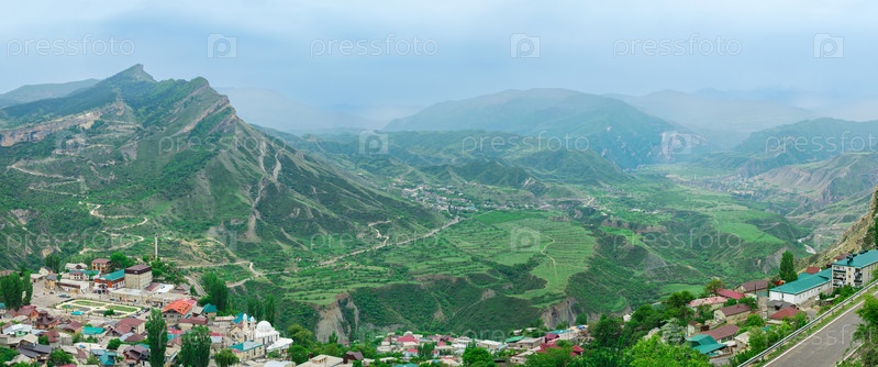 Горное село на склоне туманной долины, вид на село Гуниб в Дагестане