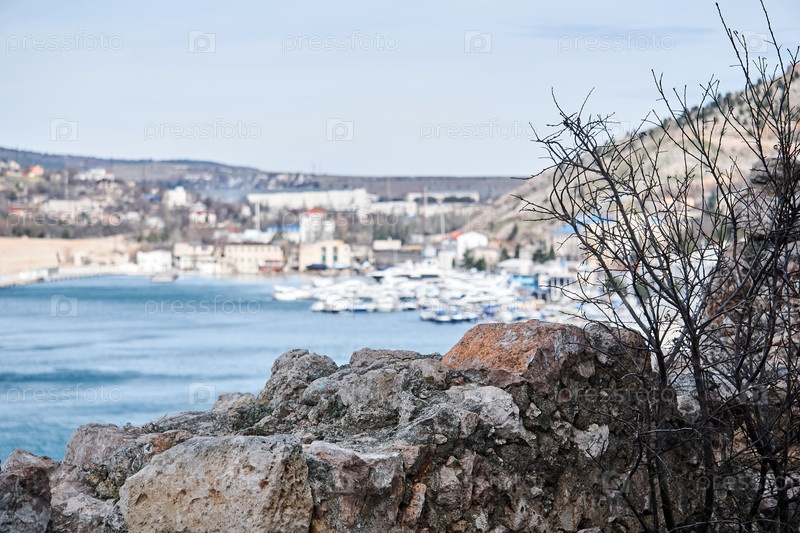 Крупный план скал и кустов на фоне размытой бухты с гаванью