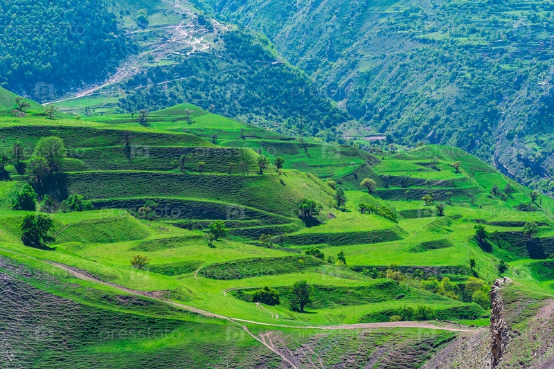 Горный пейзаж с зелеными сельскохозяйственными террасами на склонах