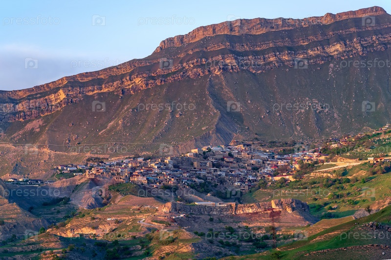 Вечерний вид на горное село Чох в Дагестане на склоне обширной долины